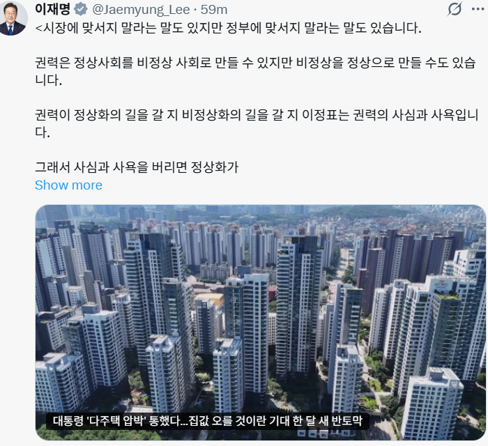 이 대통령은 24일 엑스(X·옛 트위터)에 ‘최근 집값 상승의 기대감 한 달 새 반토막’이란 제목의 기사를 공유하며 올린 글에서 “시장에 맞서지 말라는 말도 있지만 정부에 맞서지 말라는 말도 있다“고 운을 뗐다.