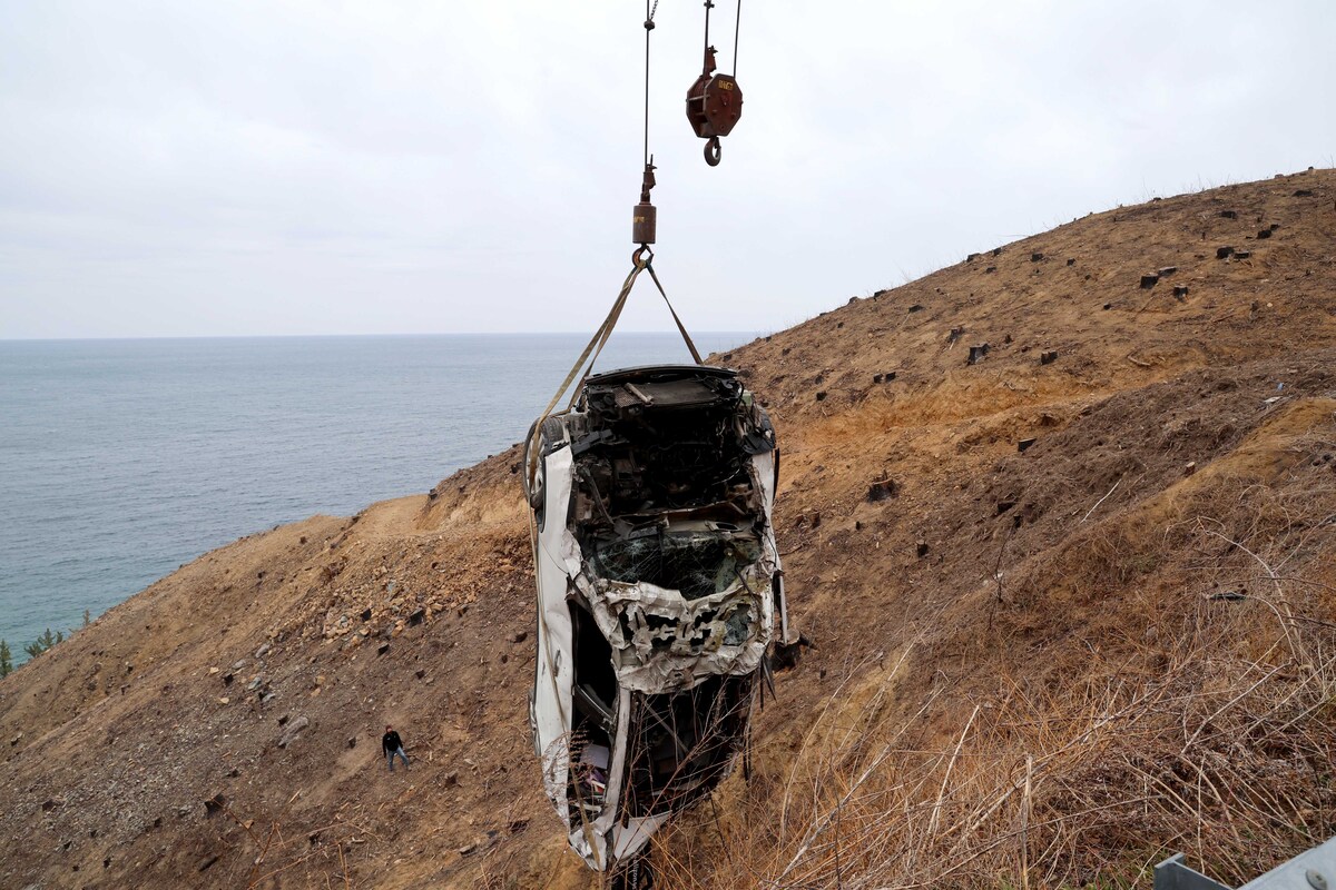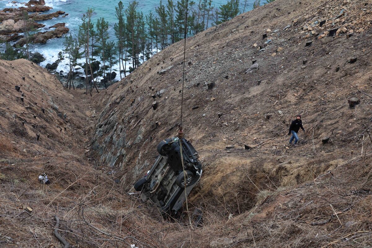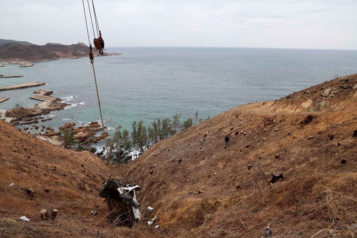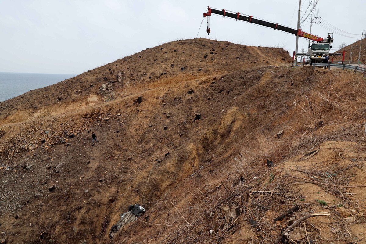 지난 23일 오후 영덕군 축산면 경정리 20번 국도 절벽 아래로 SUV 차량이 추락해 운전자가 숨지는 사고가 발생했다. 이곳은 지난해 3월 발생한 초대형 산불로 불탄 나무를 벌목한 현장으로, 나무가 있었으면 추락을 방지해 운전자 생명에는 지장이 없었을 것이라는 안타까운 지적이 이어지고 있다. 24일 오전 차량 견인업체 관계자가 대형 크레인을 동원해 사고 차량을 견인하고 있다. /이용선기자 photokid@kbmaeil.com