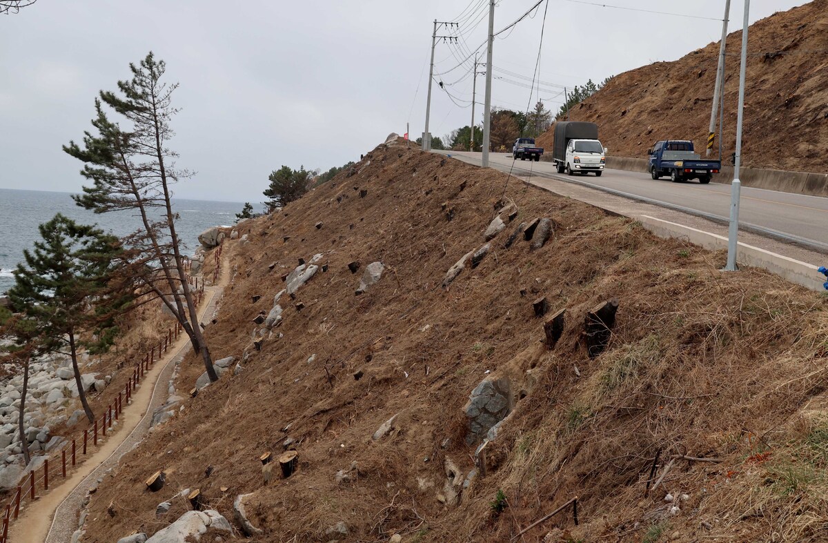 24일 오전 추락 사고 장소 인근의 또 다른 벌목 현장의 모습. 대형 나무 수십 그루를 벌목한 가운데 도로변에는 안전 펜스 등의 장치가 전혀 없는 실정이다. /이용선기자 photokid@kbmaeil.com