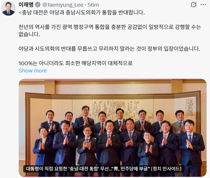 이 대통령은 24일 충남대전특별법이 국회 법사위에 상정됐으나 야당의 반대로 처리가 보류된 직후 엑스(X·옛 트위터)에 ‘충남 대전은 야당과 충남시도의회가 통합을 반대한다’는 제목으로 올린 글에서 “천년의 역사를 가진 광역 행정구역의 통합을 충분한 공감 없이 일방적으로 강행할 수는 없다“고 말했다.