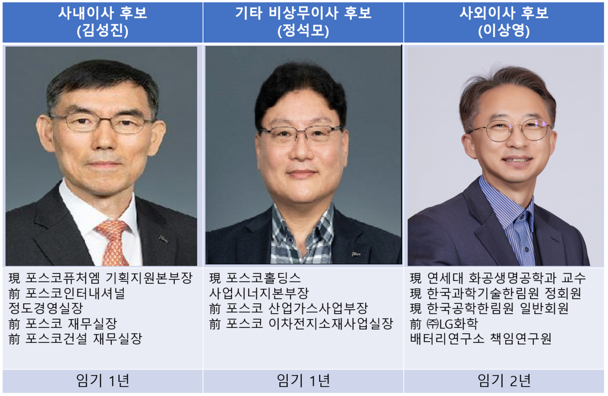 기타비상무이사 후보로는 포스코홀딩스 정석모 사업시너지본부장이 추천됐다. 정 본부장은 포스코 산업가스사업부장과 이차전지소재사업실장 등을 역임하며 신사업 발굴과 글로벌 시장 확대를 주도해 왔다. 회사는 이차전지 소재 사업에 대한 높은 이해도를 바탕으로 기업가치 제고에 기여할 것으로 기대했다.
