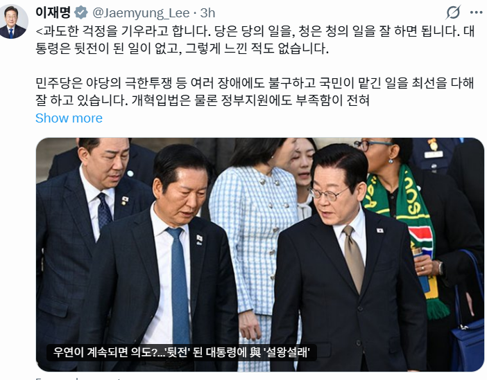 이 대통령은 25일 엑스(X·옛 트위터)에 한 인터넷매체사가 ‘민주당이 청와대를 제대로 지원하지 못하고 오히려 당청 엇박자가 노출되는 등 대통령은 뒷전이 된 모양새가 됐다’고 보도한 기사를 공유하면서 “과도한 걱정을 ‘기우’라고 한다. 당은 당의 일을, 청(청와대)은 청의 일을 잘하면 된다"면서 “대통령은 뒷전이 된 일이 없고, 그렇게 느낀 적도 없다”고 기사 내용을 반박했다.