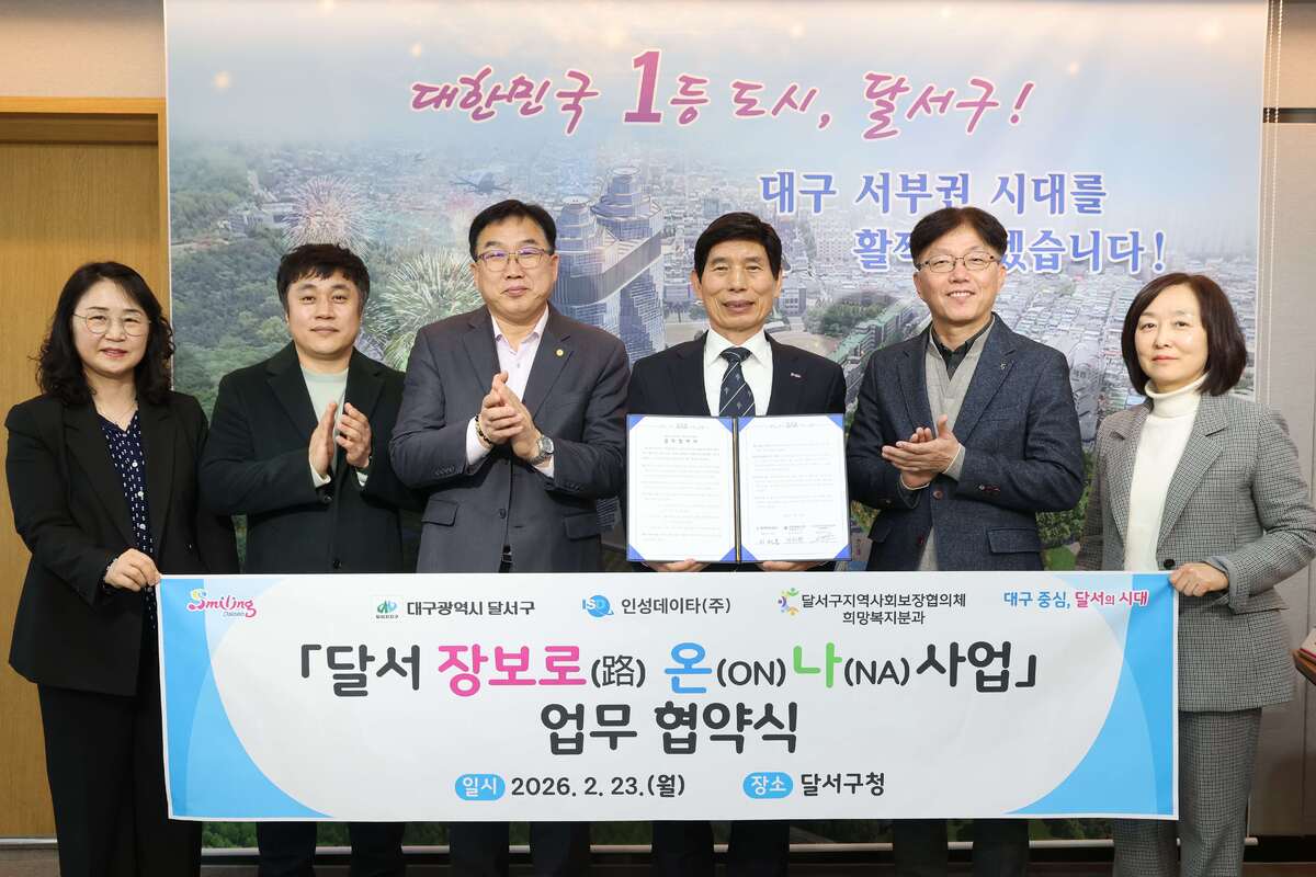달서구는 지난 23일 인성데이타㈜, 달서구지역사회보장협의체 희망복지분과와 함께 ‘달서 장보로(路) 온(ON) 나(NA)’ 사업 추진을 위한 업무협약을 체결했다.