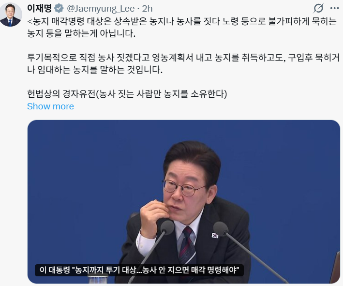 이재명 대통령은 25일 자신의 엑스(X, 옛 트위터) 계정을 통해 전날 발언에 대해 “경자유전(농사를 짓는 사람만 농지를 소유한다)의 원칙을 이해하지 못하고 이에 대해 공산당 운운하는 분들이 있다“고 지적했다.