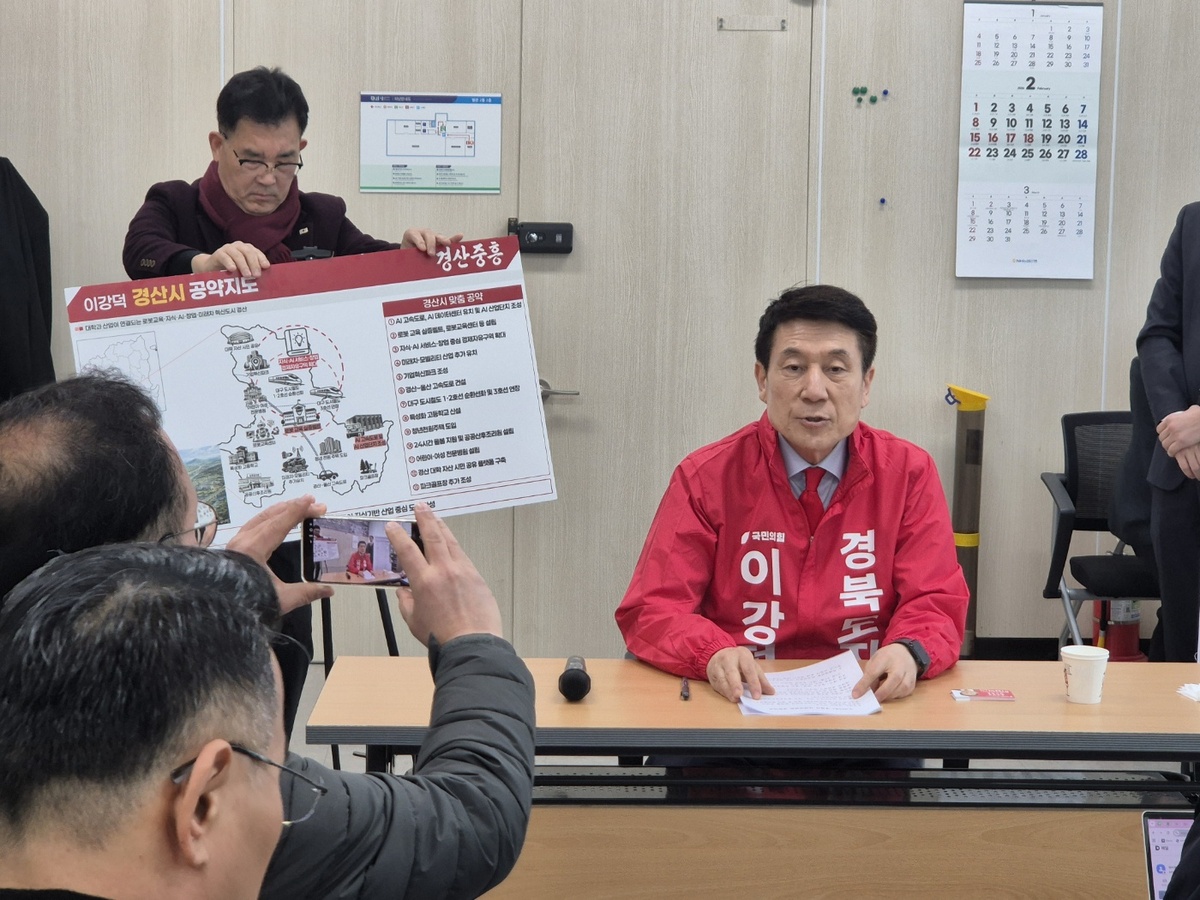 이강덕 경북도지사 예비후보가 25일 경산시청 기자실에서 기자회견으로 경산지역 맞춤형 공약을 발표했다.