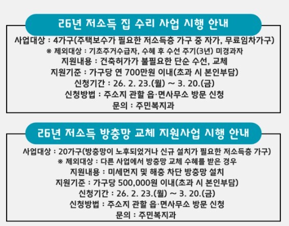 구현희 주민복지과장은 “주택 노후화로 불편을 겪는 소외계층이 더 쾌적하고 안전한 환경에서 생활할 수 있도록 내실 있게 사업을 추진하겠다”라며 “앞으로도 주민들의 복지 체감도를 높일 수 있는 맞춤형 주거 복지 정책을 지속해 발굴할 것”이라고 밝혔다.