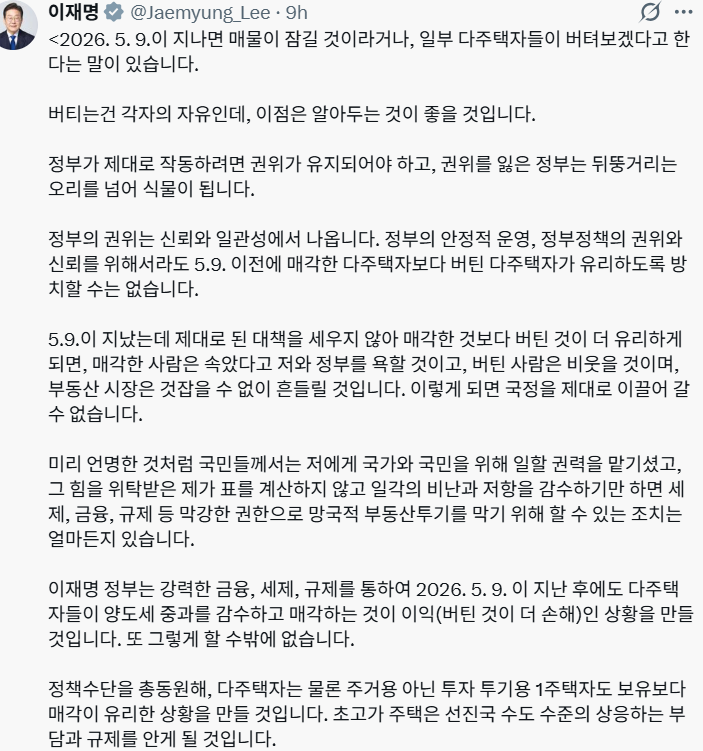 이 대통령은 “정부의 권위는 신뢰와 일관성에서 나온다. 권위를 잃은 정부는 뒤뚱거리는 오리를 넘어 식물이 된다“며 “정부 정책의 권위와 신뢰를 위해 5월 9일 이전에 매각한 다주택자보다 버틴 다주택자가 유리하도록 방치할 수 없다“고 강조했다.