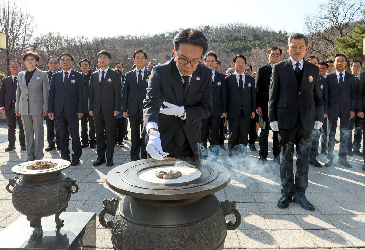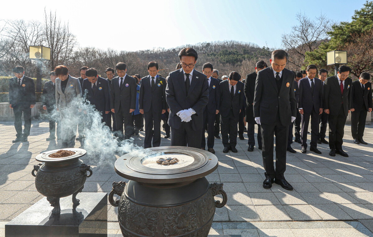 김민석 국무총리와 지역의 기관·단체장 일행이 ‘2·28 민주운동 66주년’인 28일 오전 대구시 달서구 2·28 민주운동 기념탑에서 분향하고 있다. /이용선기자 photokid@kbmaeil.com