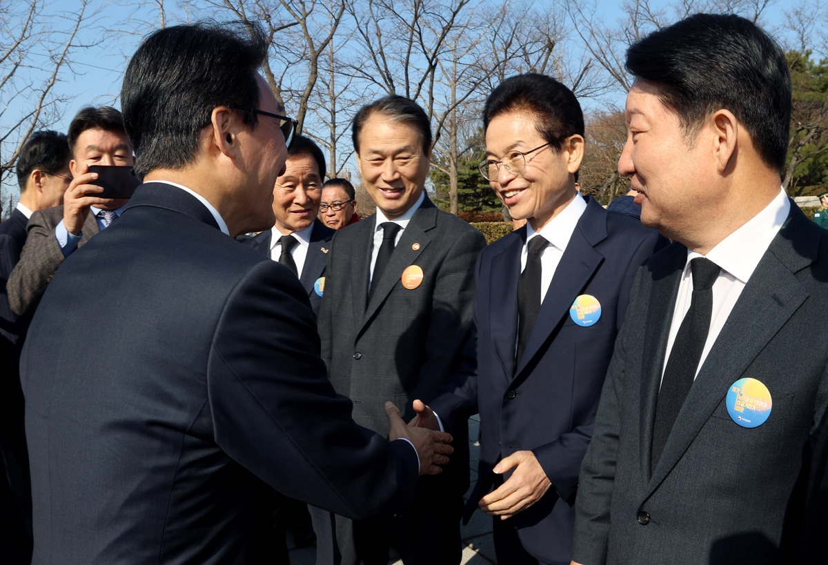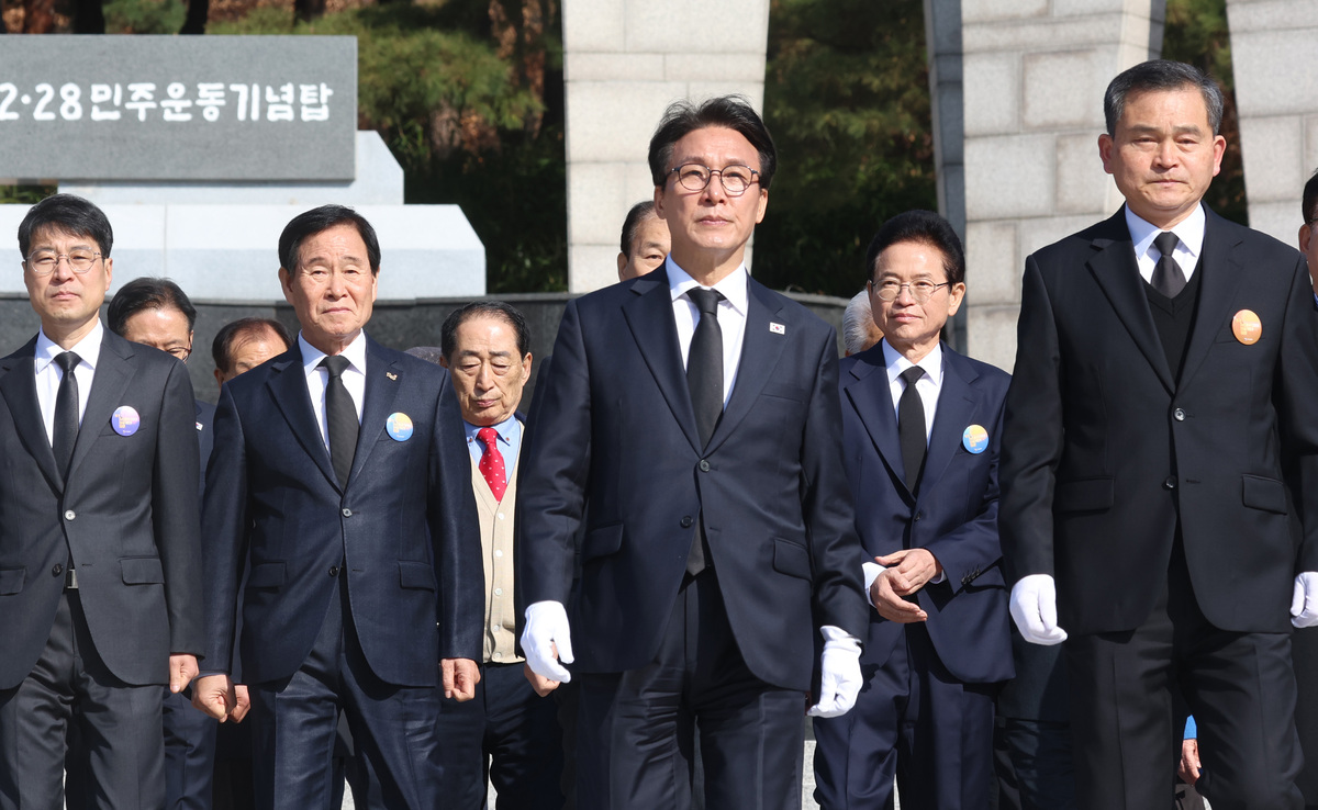 ‘2·28 민주운동 66주년’인 28일 오전 대구시 달서구 2·28 민주운동 기념탑에서 참배를 마친 김민석 국무총리와 지역의 기관·단체장 일행이 이동하고 있다. /이용선기자 photokid@kbmaeil.com