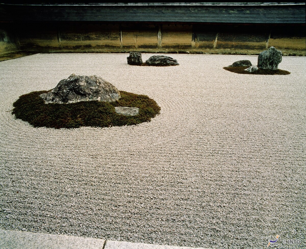 교토의 또 다른 얼굴은 절제다 사찰 순례지로 빼놓을 수 없는 료안지에 가면 절제의 의미를 선명하게 확인할 수 있다. 료안지는 절 자체보다 석정(石庭)이라 불리는 돌 정원이 명성을 떨친다. 1450년 건립한 선종사찰로 전라과 화재로 인해 대부분 소실되어 지금은 현관 겸 본당역할을 하는 방장과 일부건물만 남아 있다. 석정은 일종의 가레산스이 (枯山水)양식이다. 일종의 마른 정원이다. 나무도 꽃도 없다 일본의 전통적인 정원양식인데 돌과 모래로 산수의 풍경을 표현하는 정원이다. 중국의 산수화의 영향을 받은 것으로 차경기법이라고도 한다.