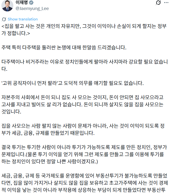 이재명 대통령은 “집을 팔고 사는 것은 개인의 자유지만, 그것이 이익이나 손실이 되게 할지는 정부가 정한다”고 밝혔다.