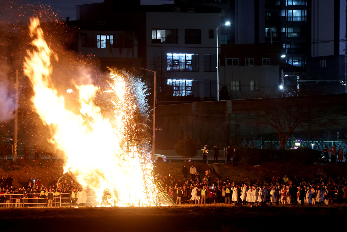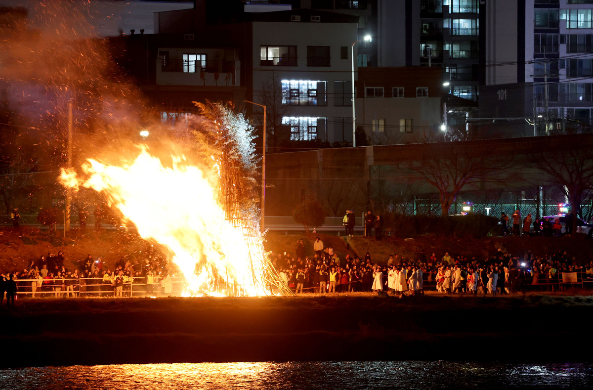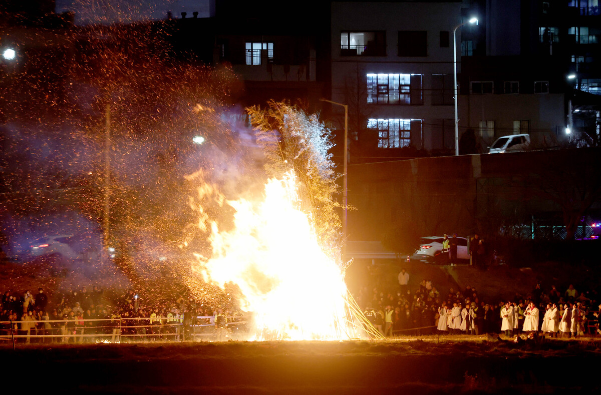 정월대보름인 3일 오후 포항시 남구 연일읍 유강리 형산강 둔치에서 주민들이 달집을 태우며 한 해 동안의 안녕과 행복을 기원하고 있다. /이용선기자 photokid@kbmaeil.com