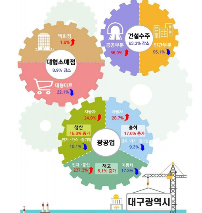 지역경제의 한 전문가는 “대구는 제조업 생산 증가세가 이어지고 있지만 소비와 건설 등 내수 부문은 여전히 부진한 모습”이며 “경북은 대형 공공 토목사업 영향으로 건설수주가 크게 늘었지만 소비 위축은 공통적으로 나타난 모습이다”고 말했다.