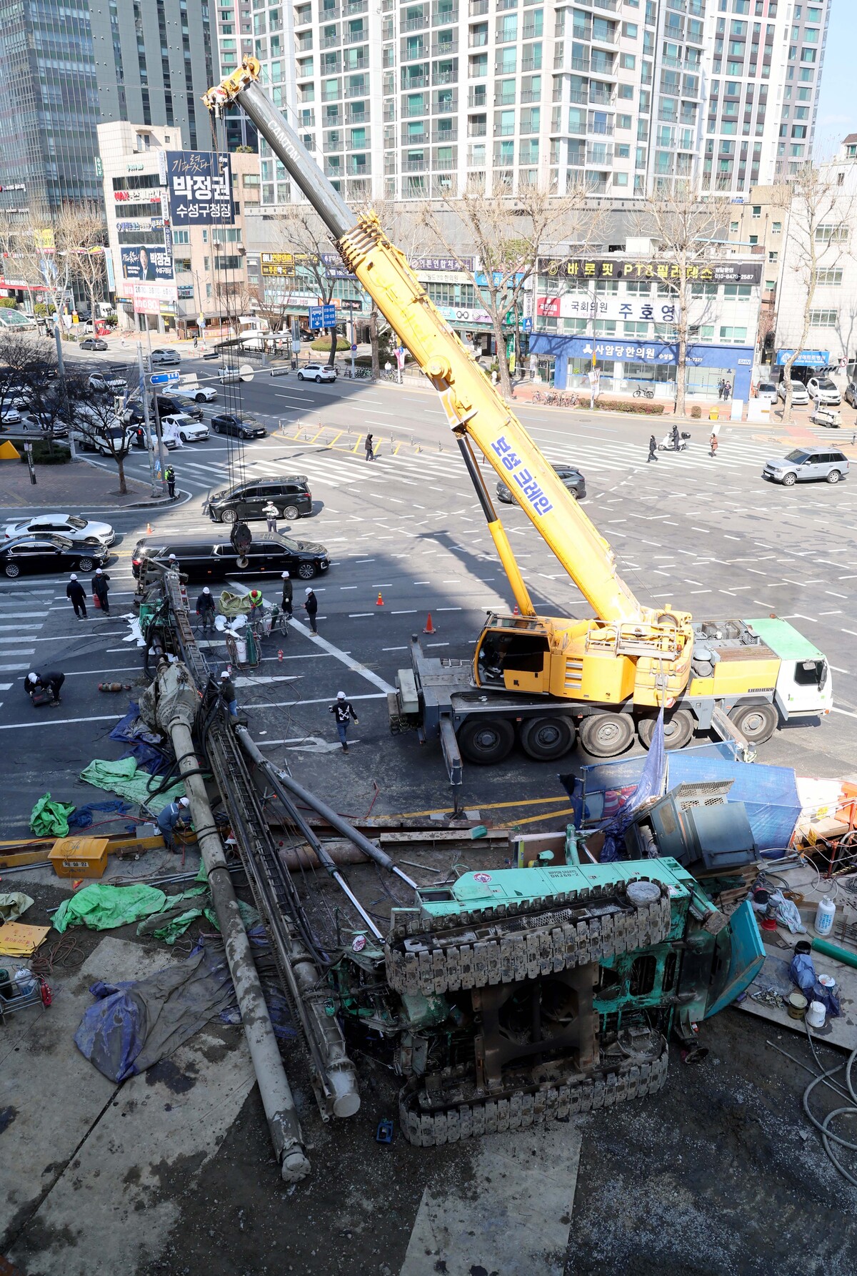4일 대구소방안전본부 등에 따르면 이날 오전 9시 6분쯤 수성구 만촌네거리 인근 도시철도 2호선 만촌역 공사 현장에서 작업 중이던 천공기가 도로 방향으로 전도됐다.