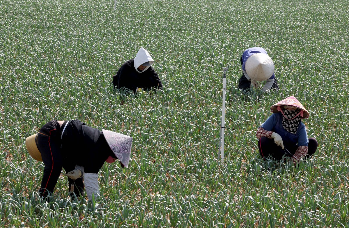 마늘밭 잡초 뽑는 외국인 계절 근로자