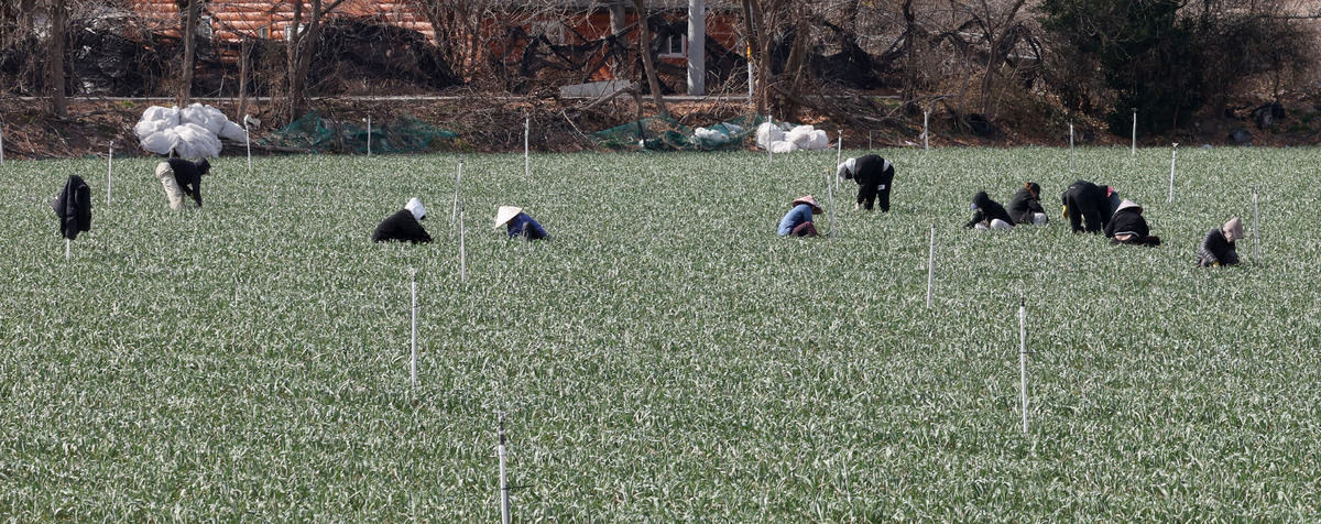 경칩 절기인 5일 오후 대구시 동구 안심3동 마늘밭에서 외국인 계절 근로자들이 잡초를 뽑고 있다. /이용선기자 photokid@kbmaeil.com