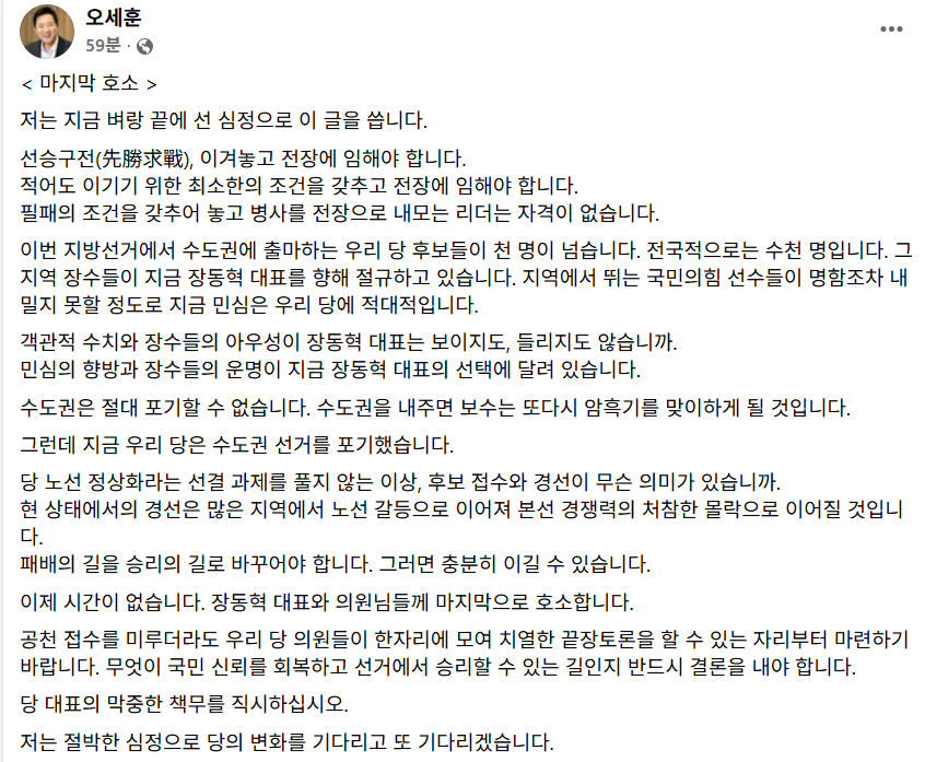 그는 ”지금 벼랑 끝에 선 심정으로 이 글을 쓴다“면서 ”이겨놓고 전장에 임해야 하는데 필패의 조건을 갖춰놓고 병사를 전장으로 내모는 리더는 자격이 없다“고 장 대표와 지도부의 자격 미달을 거론했다.