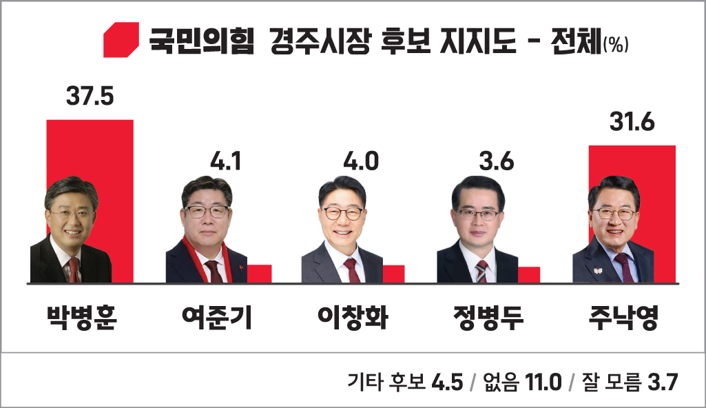 이번 조사는 본지가 국민의힘 경주시장 공천 신청이 진행되던 지난 6~8일, ㈜에브리리서치에 의뢰해 실시했다. 조사 결과에 따르면 박병훈 현 국민의힘 중앙위원회 상임고문이 37.5%, 주낙영 시장이 31.6%를 얻어 오차범위 내에서 치열한 접전을 벌이고 있는 것으로 나타났다. 다음으로 여준기 현 경주시체육회 회장이 4.1%, 이창화 전 국가정보원 담당관이 4%, 전병두 전 국회의원 종로구 보궐선거 예비후보자가 3.6%를 기록했다. ‘지지 후보가 없다’는 11%, ‘모름’은 3.7%, 그 외 인물을 답한 사람은 4.5%였다.