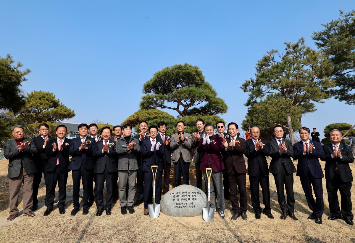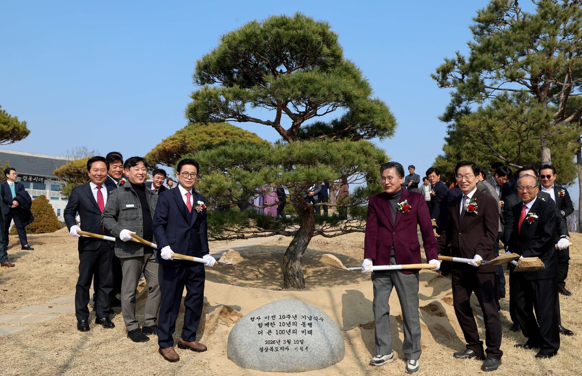 경상북도 청사 이전 10주년 기념식이 10일 오후 도청 새마을광장에서 열렸다. 기념식에 앞서 이철우 도지사, 박성만 도의회 의장, 임종식 도 교육감을 비롯한 기관·단체장들이 기념 식수하고 있다. /이용선기자 photokid@kbmaeil.com