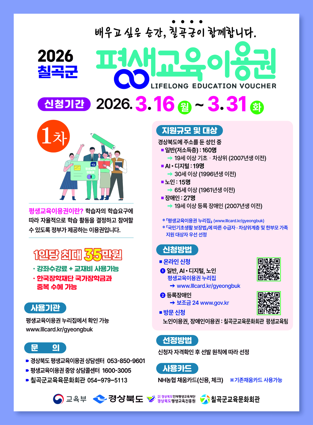 지원 대상은 칠곡군에 주민등록을 둔 성인으로 △19세 이상 기초생활수급자 및 차상위계층 △30세 이상 디지털 교육 수강 희망자 △65세 이상 노인 △19세 이상 등록 장애인이다. 선정된 학습자에게는 NH농협 채움카드에 35만 원 상당의 포인트가 지급되며, 평생교육이용권 사용기관에서 온·오프라인 강좌 수강료와 교재비로 사용할 수 있다.