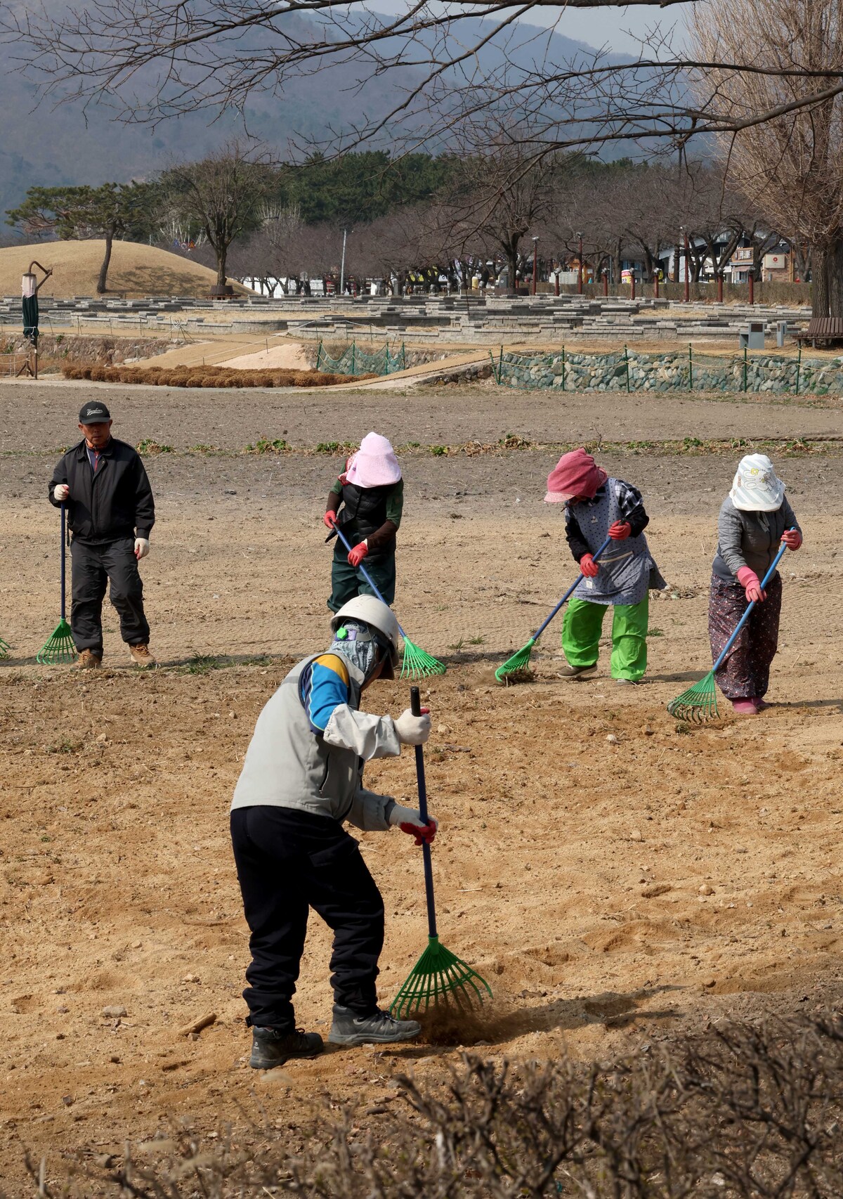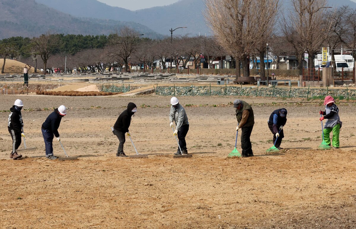 12일 오후 경주 동부사적지 첨성대 인근에서 공공근로자들이 땅을 고르며 봄꽃 심을 준비를 하고 있다. 이곳은 계절에 따라 다양한 꽃을 심어 관광객의 발길이 이어지는 지역이다. /이용선기자 photokid@kbmaeil.com