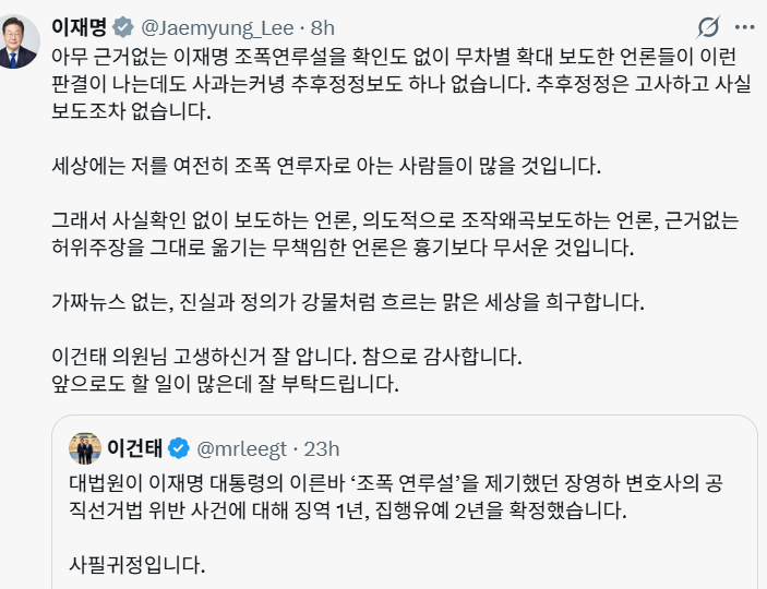 이 대통령은 14일 엑스(X·옛 트위터)에 대법원이 공직선거법상 허위사실 공표 혐의로 기소된 장 위원장에 징역 1년에 집행유예 2년을 선고한 원심을 확정한 소식을 전한 더불어민주당 이건태 의원의 글을 공유하고 “가짜뉴스 없는, 진실과 정의가 강물처럼 흐르는 맑은 세상을 희구한다“고 말했다.