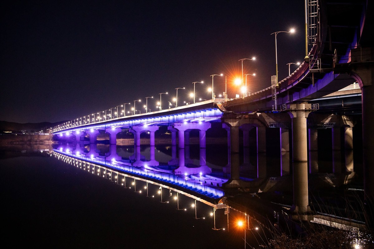 구미시가 산호대교 야간경관 조성사업을 마치며 낙동강의 밤 풍경을 조명으로 물들이고 있다.