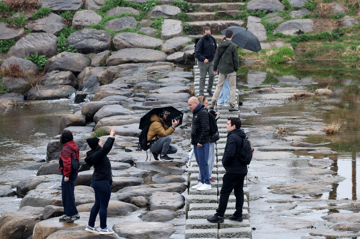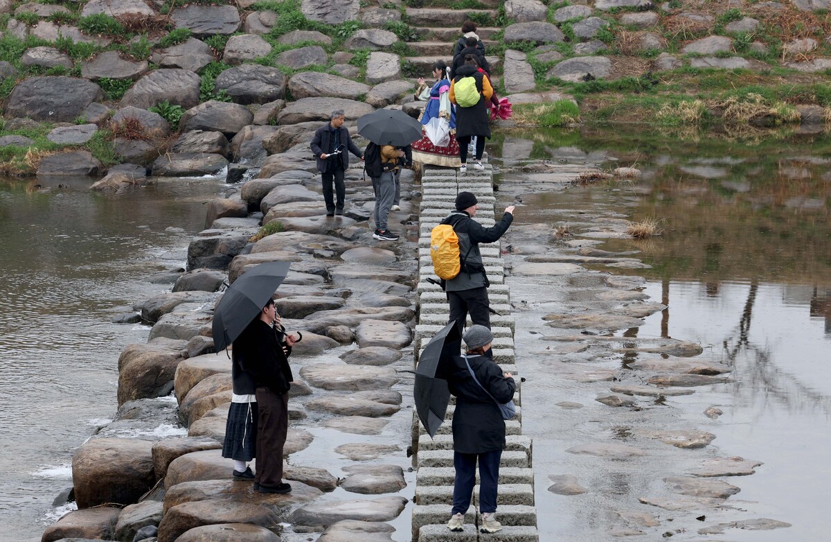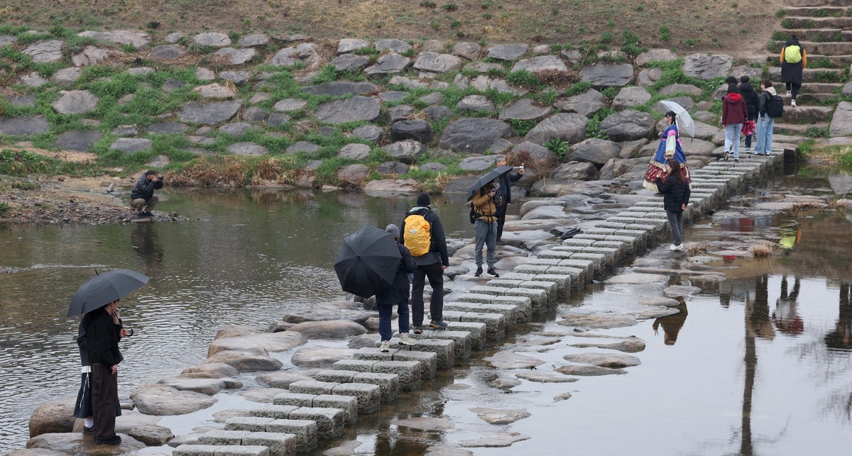 춘분을 이틀 앞두고 봄비가 오락가락한 18일 오후 경주 월정교 징검다리를 찾은 외국 관광객들이 한국에서의 추억을 카메라에 담고 있다. /이용선기자 photokid@kbmaeil.com