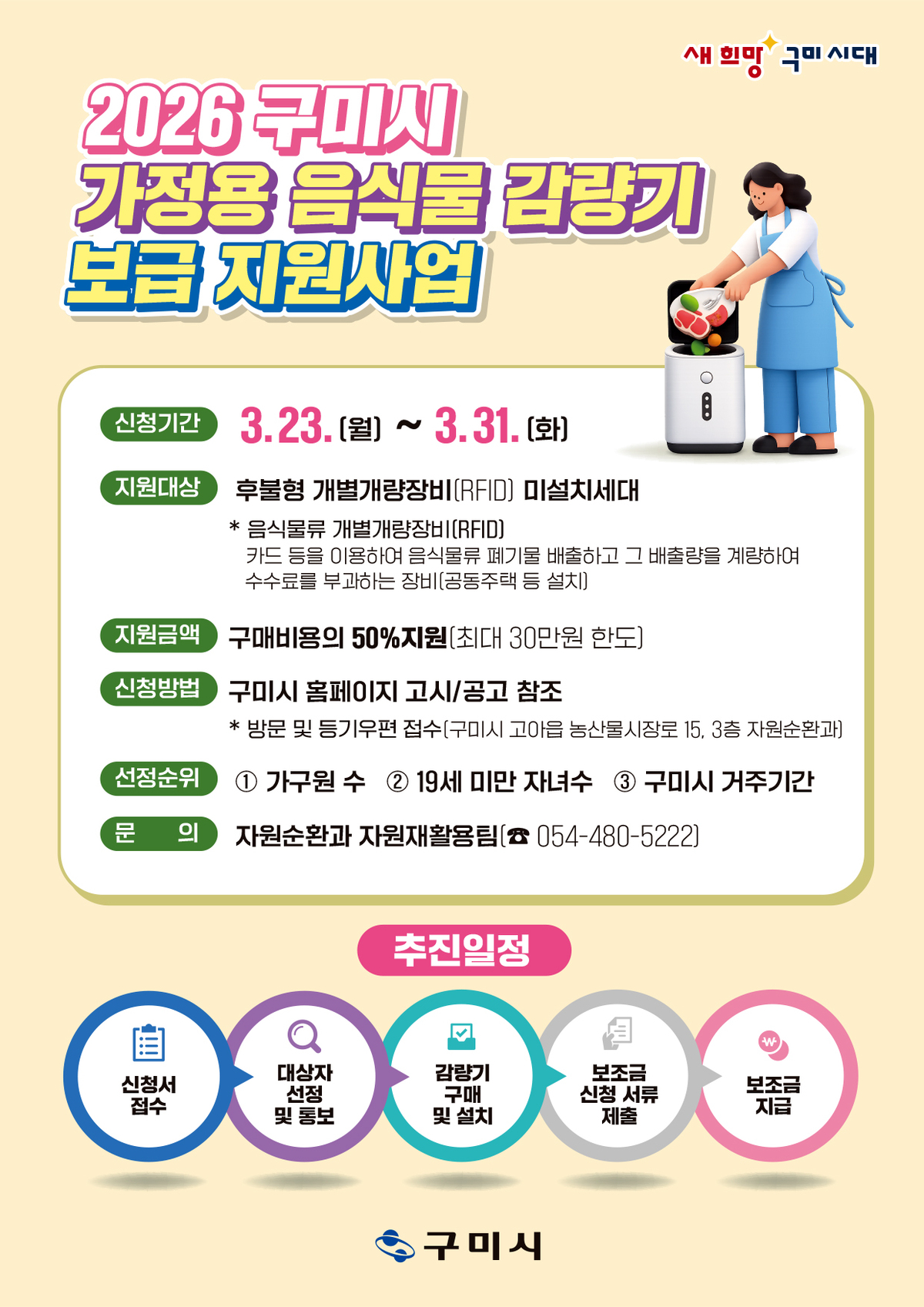 구미시는 음식물류 폐기물 관리 사각지대를 해소하고 배출 편의를 높이기 위해 ‘가정용 음식물 감량기 보급 지원사업’을 추진한다.