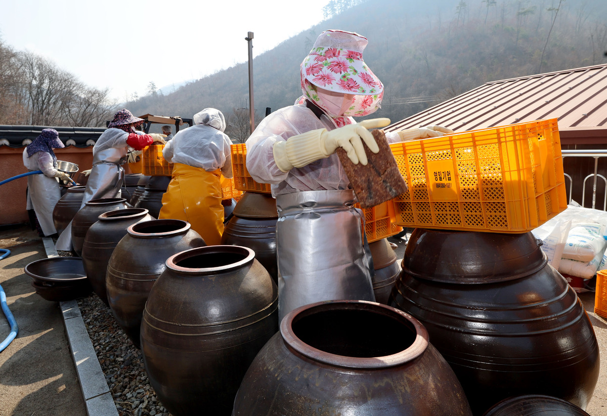항아리에 들어가기 전 메주는 혹독한 목욕을 거친다. 수개월간 볏짚에 매달려 발효되며 묻은 먼지를 솔로 일일이 털어내고 흐르는 물에 씻어낸다. 죽장의 칼바람 아래 다시 몸을 말린 뽀얀 메주 20개가 옹기 바닥에 차곡차곡 박혔다.