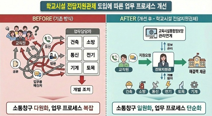 기존에는 학교에서 공사 감독이나 시설관리와 관련한 문제가 발생하면 토목·건축·기계·전기·소방 등 분야별 담당자를 각각 찾아야 하는 불편이 있었다. 이에 경북교육청은 기술직 공무원을 학교와 1대1로 매칭해 전담 지원하는 제도를 도입했다.