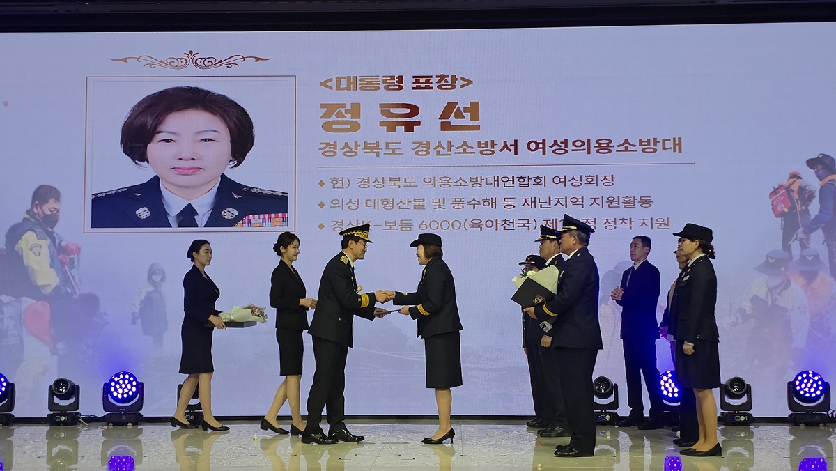 경상북도 여성의용소방대 연합회장이자 경산소방서 여성의용소방대 연합회장인 정유선 회장이 ‘제5주년 의용소방대의 날’ 기념행사에서 대통령 표창을 받았다.