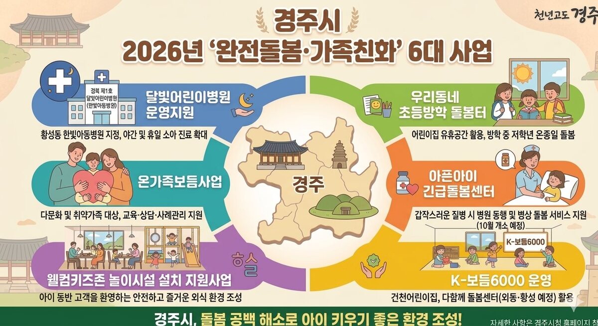 경주시는 야간과 주말, 방학, 긴급상황까지 아우르는 전방위 돌봄 체계 구축을 목표로 6개 핵심 사업을 추진한다고 24일 밝혔다.