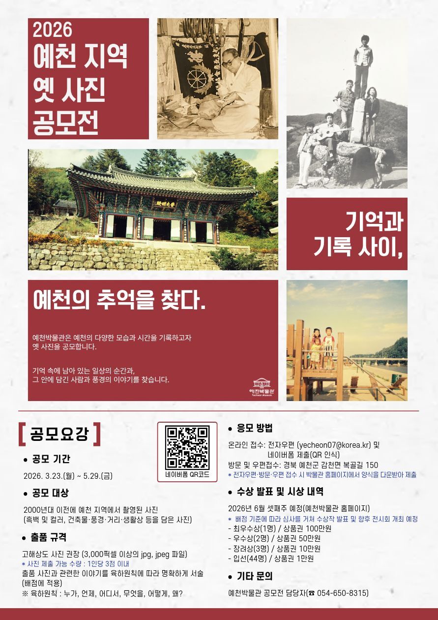 예천박물관은 지역의 역사와 생활상을 담은 기록을 수집·공유하기 위해 ‘2026 예천 지역 옛 사진 공모전 - 기억과 기록 사이, 예천의 추억을 찾다’를 진행한다고 밝혔다.