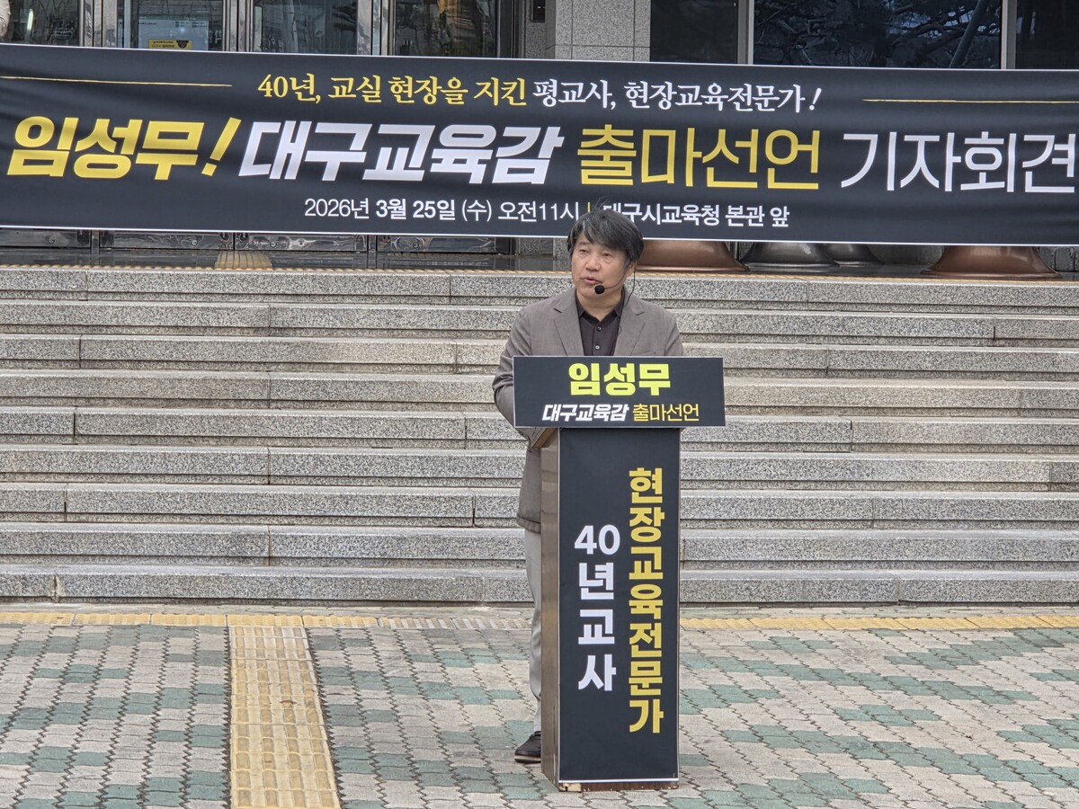 임성무 전 전국교직원노동조합 대구지부장이 25일 대구시교육청에서 기자회견을 열고 오는 6월 지방선거 대구시교육감 선거 출마를 공식 선언했다. 이번 선거에서 첫 출마 선언으로, 향후 선거 구도 형성의 출발점이 될 전망이다.