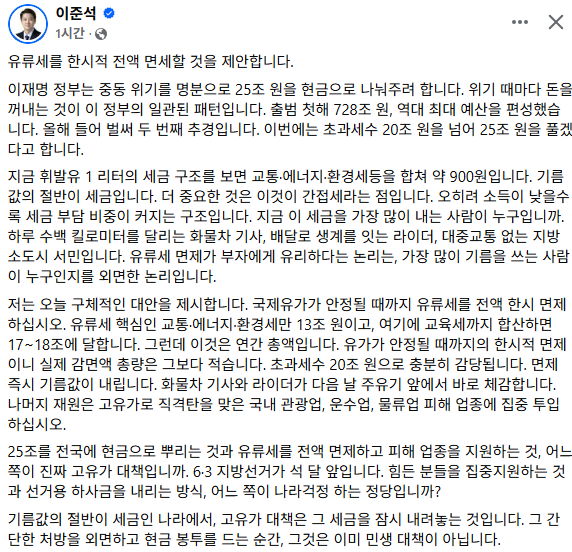 이 대표는 25일 자신의 페이스북에 “휘발유 1 리터의 세금 구조를 보면 교통·에너지·환경세등을 합쳐 약 900원이다. 기름값의 절반이 세금이고, 더 중요한 것은 이것이 간접세라는 점”이라면서 “소득이 낮을수록 세금 부담 비중이 커지는 구조인 상황에서 국제유가가 안정될 때까지 유류세를 한시적으로 면제하자”고 (이재명 대통령에게) 제안했다.