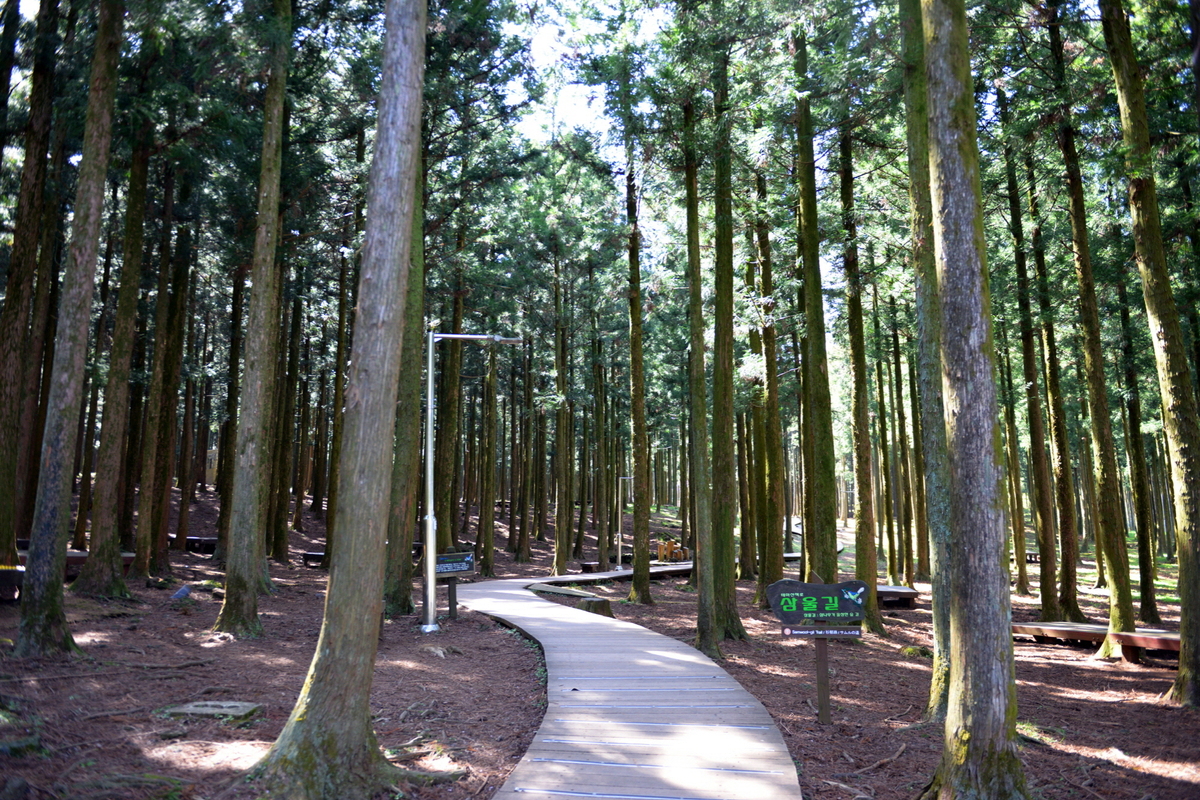 빽빽하게 우거진 삼나무 사이사이를 따라 구불구불하게 이어진 흙길의 총 길이는 11.1km로 긴 거리가 부담스러운 여행객은 절물휴양림에서 산책로 일부만 이용할 수 있어 어린이나 노약자 할 것 없이 모두 걷기 편한 길을 선택할 수 있다.