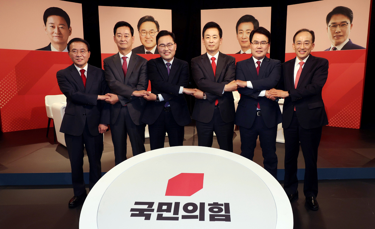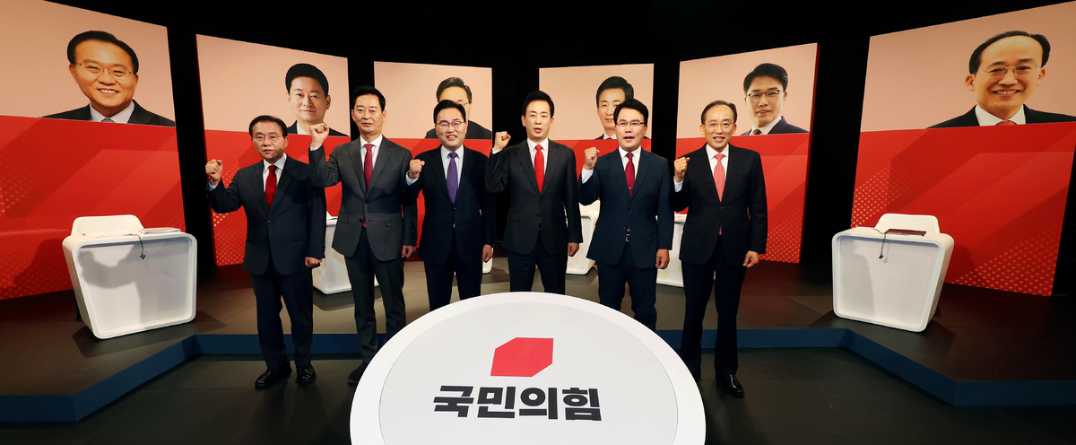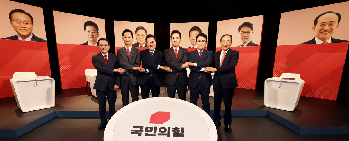 30일 오후 대구 TBC에서 열린 6.3 지방선거 국민의힘 대구시장 후보 1차 비전 토론회에서 왼쪽부터 윤재옥·최은석·홍석준·유영하·이재만·추경호 후보가 포즈를 취하고 있다. /이용선기자 photokid@kbmaeil.com