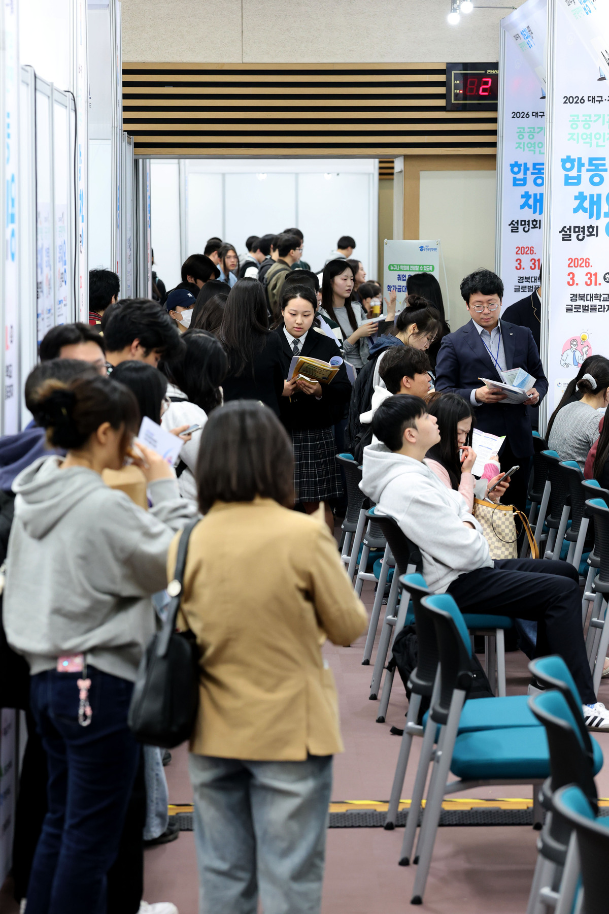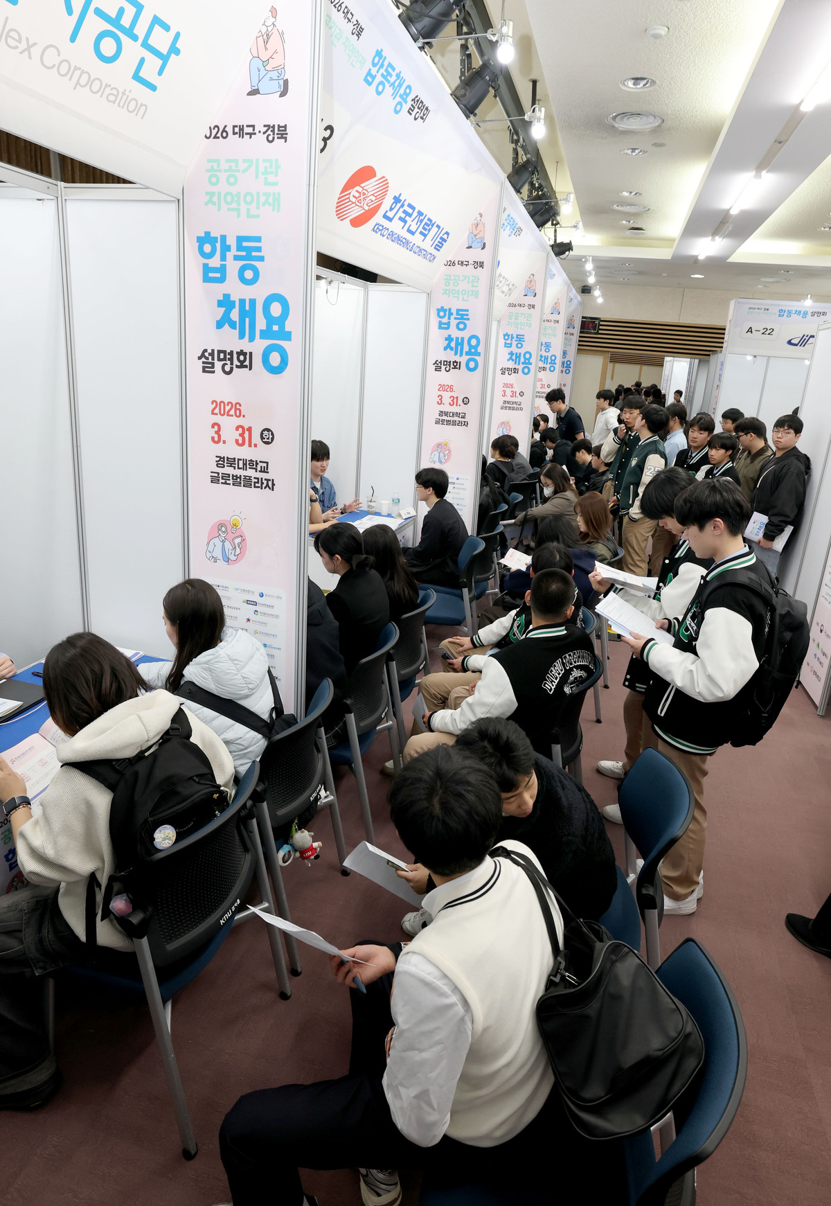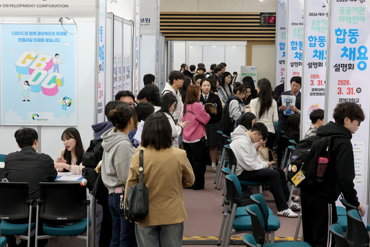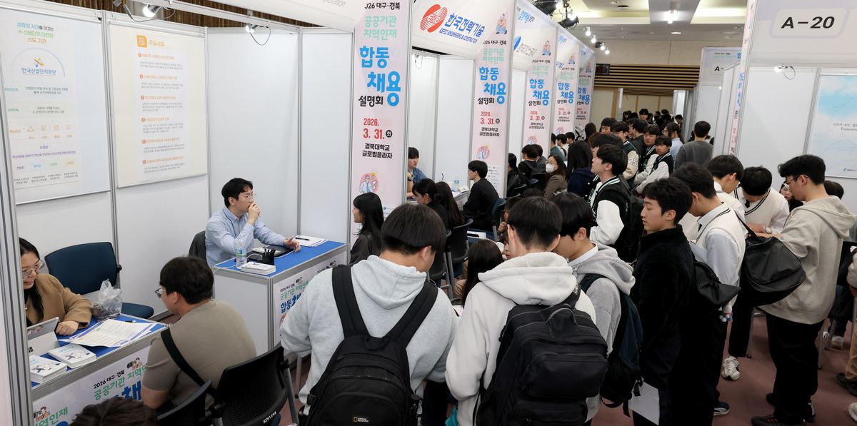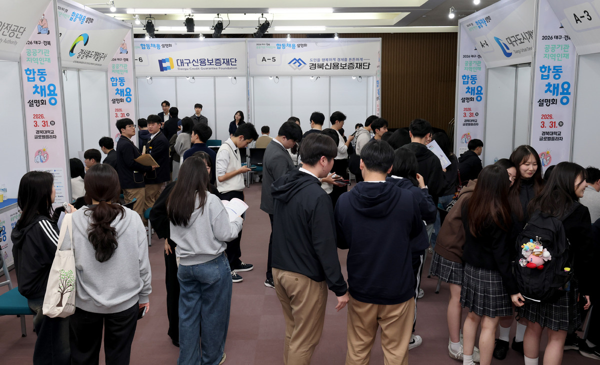 ‘2026 대구·경북 공공기관 지역인재 합동채용설명회’가 31일 경북대학교 글로벌플라자에서 열렸다. 행사장을 찾은 취업준비생들이 취업을 원하는 공공기관 부스에서 상담하고 있다. 이번 설명회에는 한국가스공사, 한국부동산원 등 대구 공공기관 9개 기관과 한국도로공사, 한국전력기술 등 경북 공공기관 7개 기관 및 민간기업(iM뱅크) 등 26개 기관이 참여했다. /이용선기자 photokid@kbmaeil.com