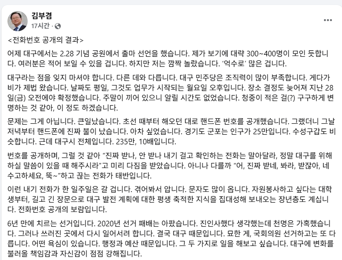 문자 메시지도 이어졌다. 김 전 총리는 “자원봉사를 하겠다는 대학생부터 대구 발전 방안을 길게 정리해 보내온 시민까지 다양했다”며 “대구 발전 계획에 대한 평생 축적한 지식을 집대성해 보내오는 장년층도 있었다. 전화번호 공개의 보람”이라고 털어놨다.