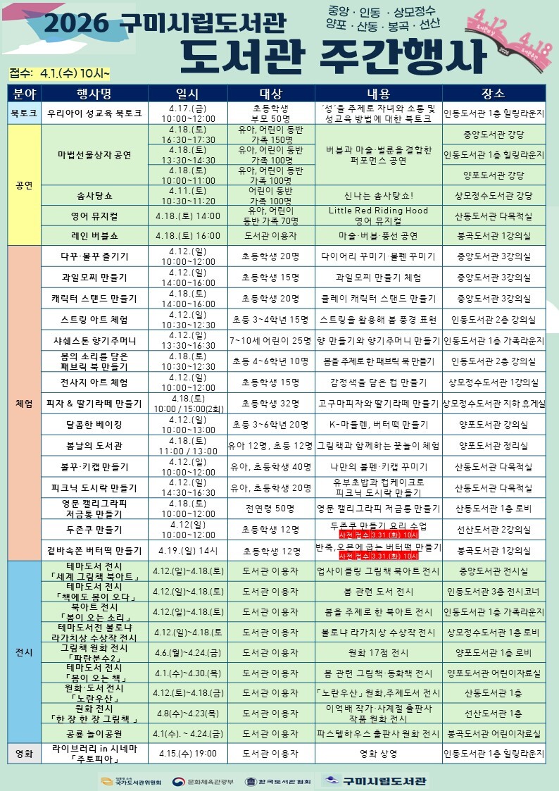 구미시는 2026 도서관의 날 및 도서관 주간을 맞아 12일부터 18일까지 시립도서관 7개관에서 다양한 독서문화 행사를 개최한다.