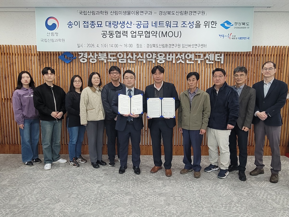 이번 협약은 최근 경북 지역 대형 산불로 송이 생산 기반이 크게 훼손된 상황에서, 기존 송이 감염묘 방식의 한계를 극복하고 보다 효율적인 복원 체계를 마련하기 위한 것으로, 기존 방식은 양묘부터 활착까지 8년 이상 소요되고 생존율도 낮아 복원 수요에 대응하기 어려웠다.