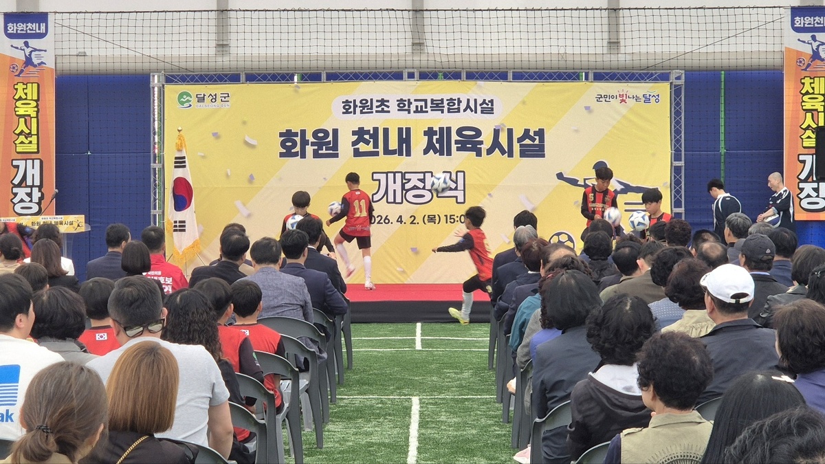 달성군은 2일 화원초등학교 내 학교복합시설 ‘화원 천내 체육시설’ 개장식을 열고, 이달 시범 운영을 거쳐 5월 1일부터 정식 운영에 들어간다고 밝혔다. 이날 행사에는 최재훈 군수와 강은희 대구시교육감, 유소년축구단, 학부모, 주민 등 150여 명이 참석했다.