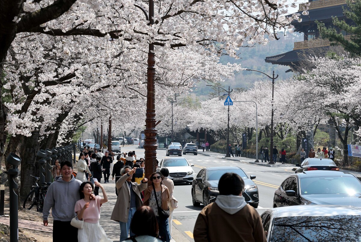 봄꽃의 여왕. 벚꽃 군락지가 있는 경주에 연분홍빛 벚꽃의 향연이 펼쳐지고 있다. 대표적인 장소인 흥무로의 벚꽃 터널은 이미 절정을 맞이했고, 시내 지역과 기온 차이로 며칠의 시차를 두고 피는 보문단지의 벚꽃은 이번 주말 절정을 맞을 것으로 보인다. 망설이면 올해의 벚꽃이 스쳐 간다. 이번 주말이 지나면 이토록 탐스러운 벚꽃을 못 볼 수도 있다. 2일 오후 경주 흥무로와 보문단지의 벚꽃을 화보에 담았다. /이용선기자 photokid@kbmaeil.com