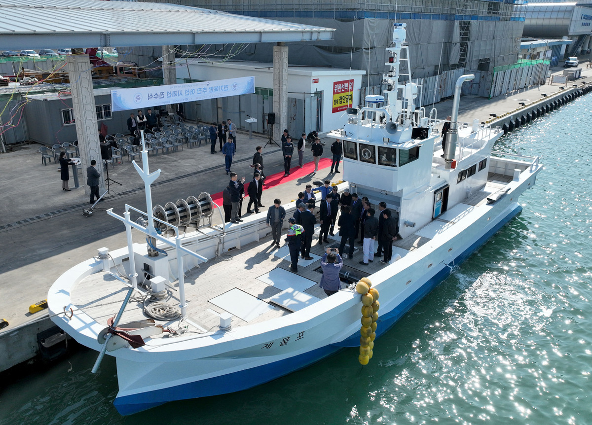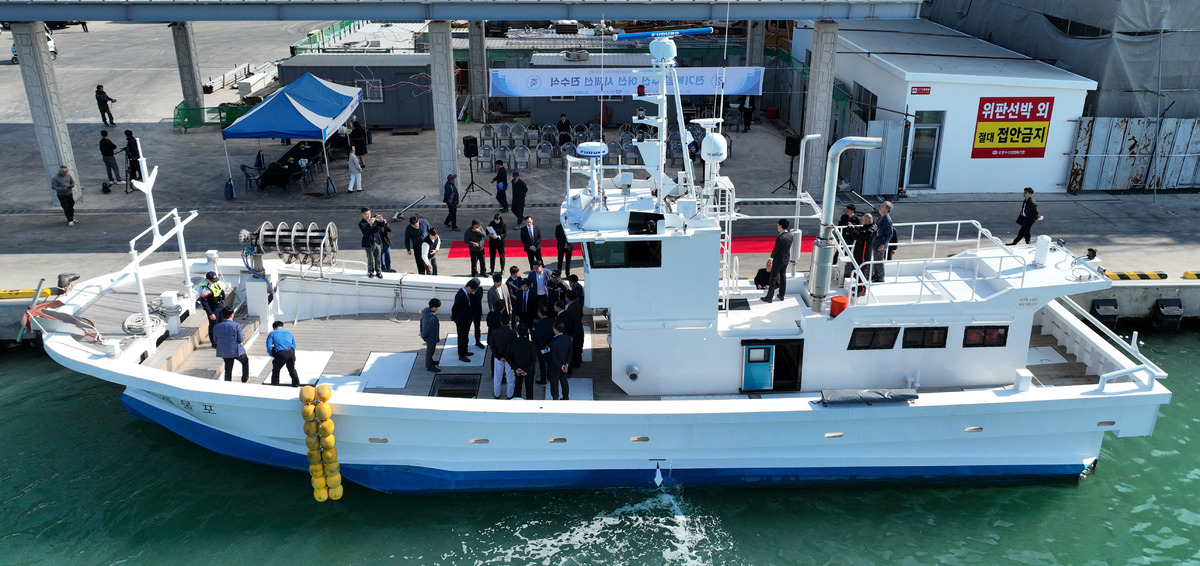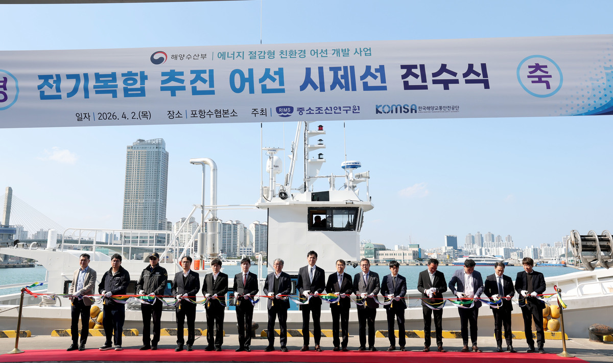 해양수산부의 ‘에너지 절감형 친환경 어선개발사업’으로 추진된 전기복합 추진 어선 시제선 진수식이 2일 오후 포항시 남구 송도동 포항수협 부두에서 열렸다. 행사에 참석한 내빈과 관계자들이 축하 테이프를 자르고 있다. /이용선기자 photokid@kbmaeil.com