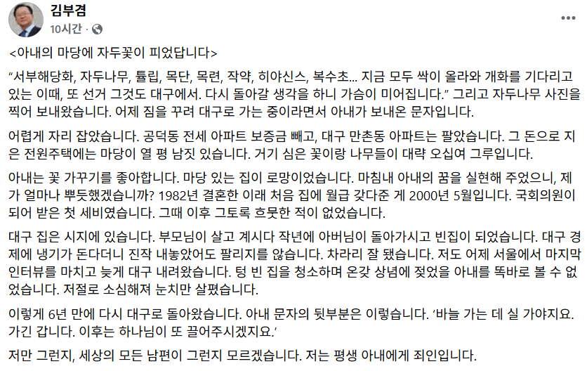 고심끝에 대구시장 출마를 선언한 김부겸 전 국무총리가 출마를 반대하던 아내가 결국 남편을 지지하게 된 사연을 밝히며 “저는 아내에게 평생 죄인입니다”는 글로 선거에 임하는 심경을 토로했다.