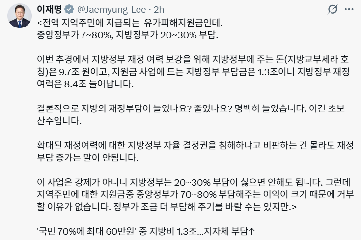 이 대통령은 이날 오전 엑스(X·옛 트위터)에 이번 고유가 피해지원금의 지방정부 부담 비율이 지난해 민생회복 소비쿠폰 지급 당시 부담률인 10%(서울은 25%)에서 20%(서울은 30%)로 높아졌다는 내용의 기사를 첨부하며 이같이 적었다.