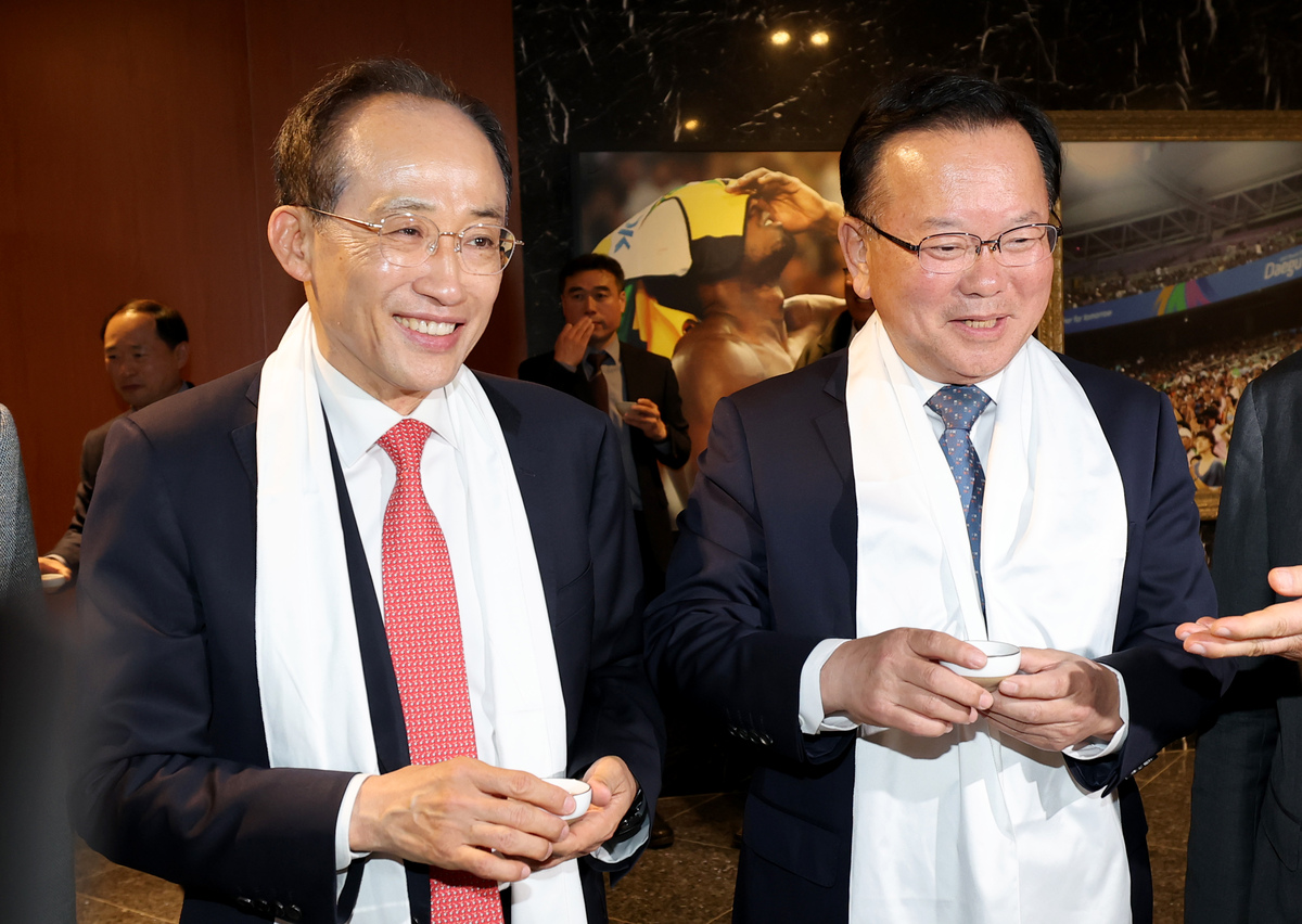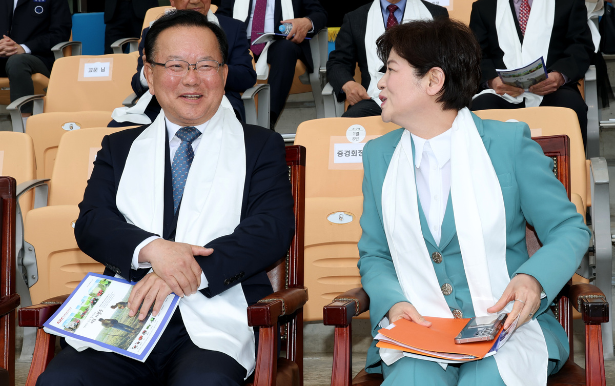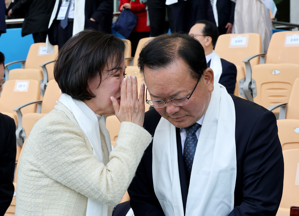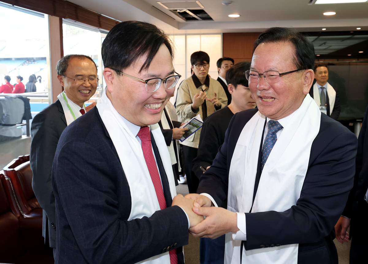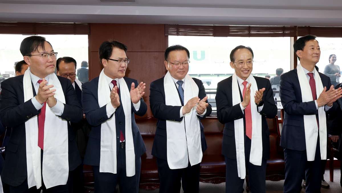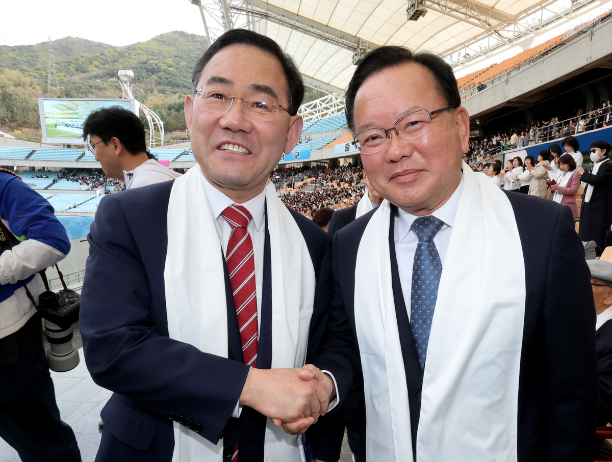 6.3 지방선거에서 대구시장 출마 포부를 밝힌 정치인들이 5일 오후 대구 스타디움에서 열린 부활절 연합예배에서 처음으로 한자리에 모였다. 더불어민주당 김부겸 후보(앞줄 왼쪽), 국민의힘 유영하(앞줄 오른쪽), 윤재옥(앞줄 왼쪽 여섯 번째), 이재만(두 번째 줄 왼쪽 네 번째), 최은석(앞줄 오른쪽 두 번째), 추경호(앞줄 오른쪽 네 번째), 홍석준(두 번째 줄 왼쪽 다섯 번째) 예비후보(가나다순) 와 주호영 국회부의장(앞줄 왼쪽 다섯 번째)이 예배에 참석하고 있다. /이용선기자 photokid@kbmaeil.com