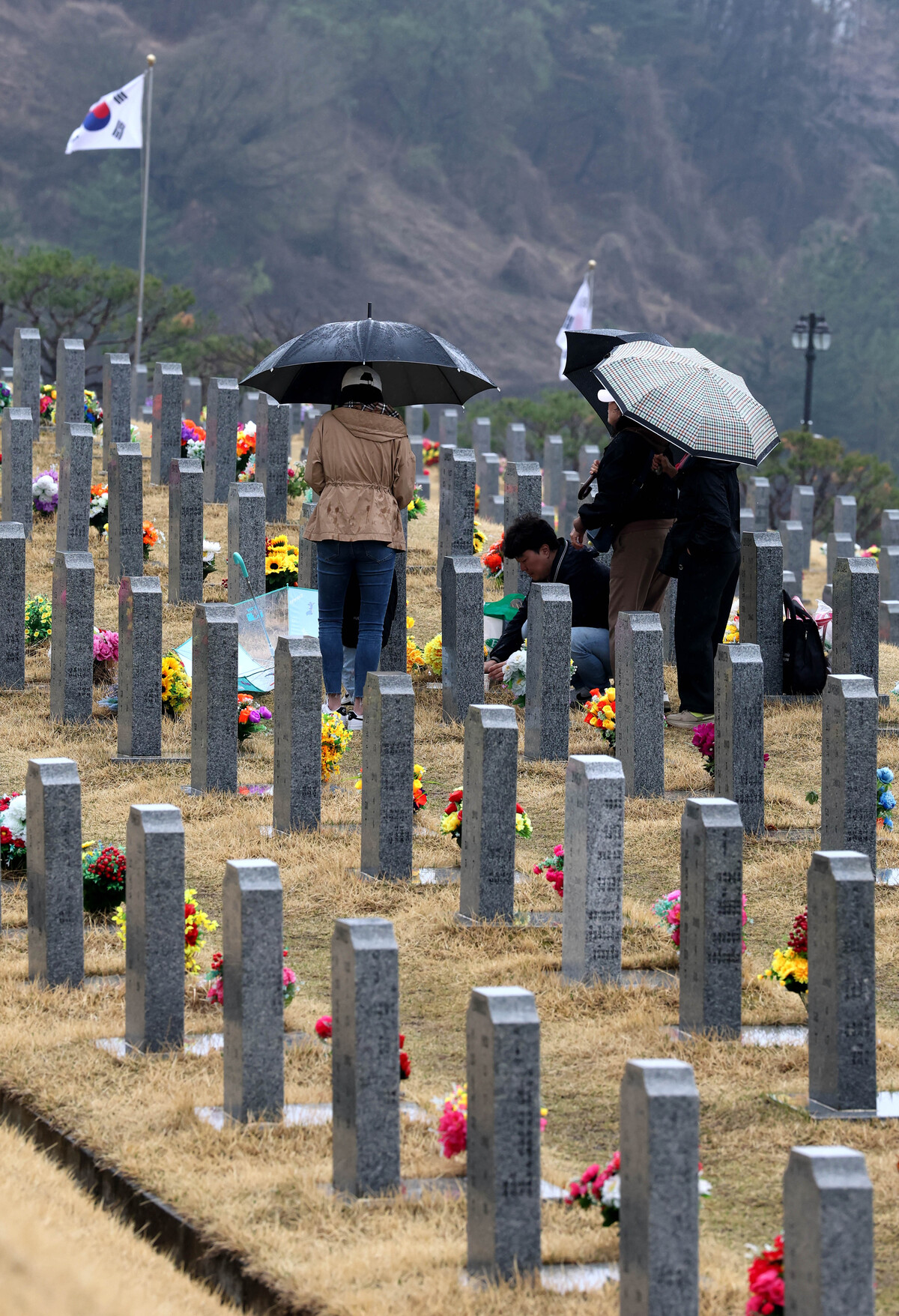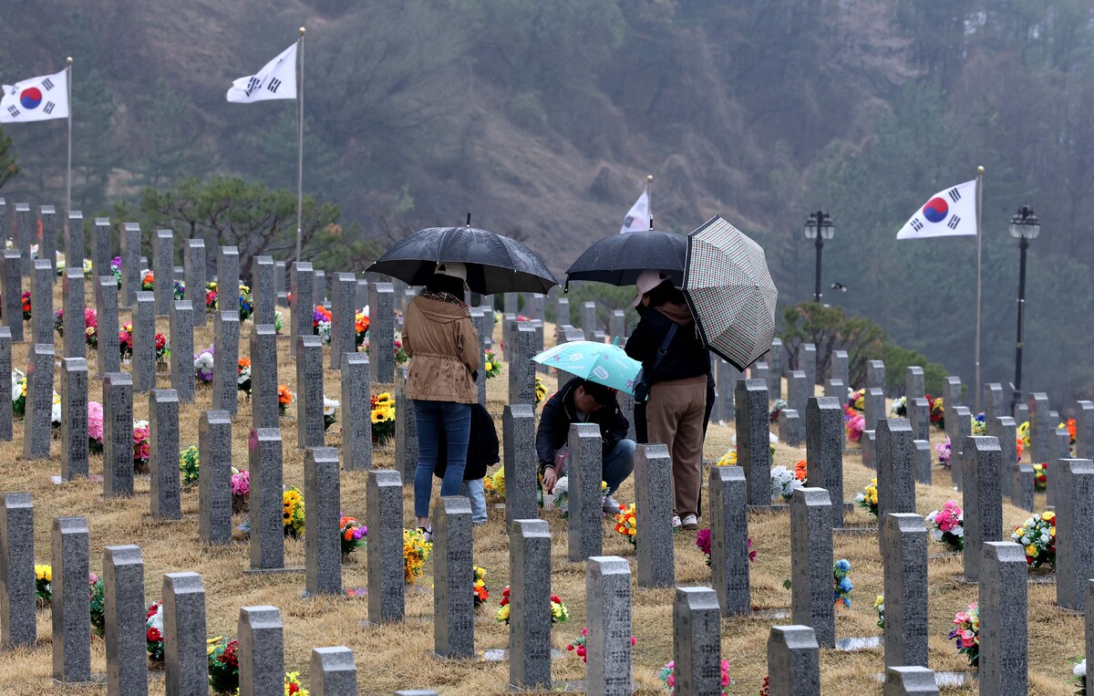 설날, 단오, 추석과 함께 우리나라 4대 명절의 하나인 한식인 6일 오후 영천호국원을 찾은 후손들이 봄비가 내리는 가운데 성묘를 하고 있다. /이용선기자 photokid@kbmaeil.com