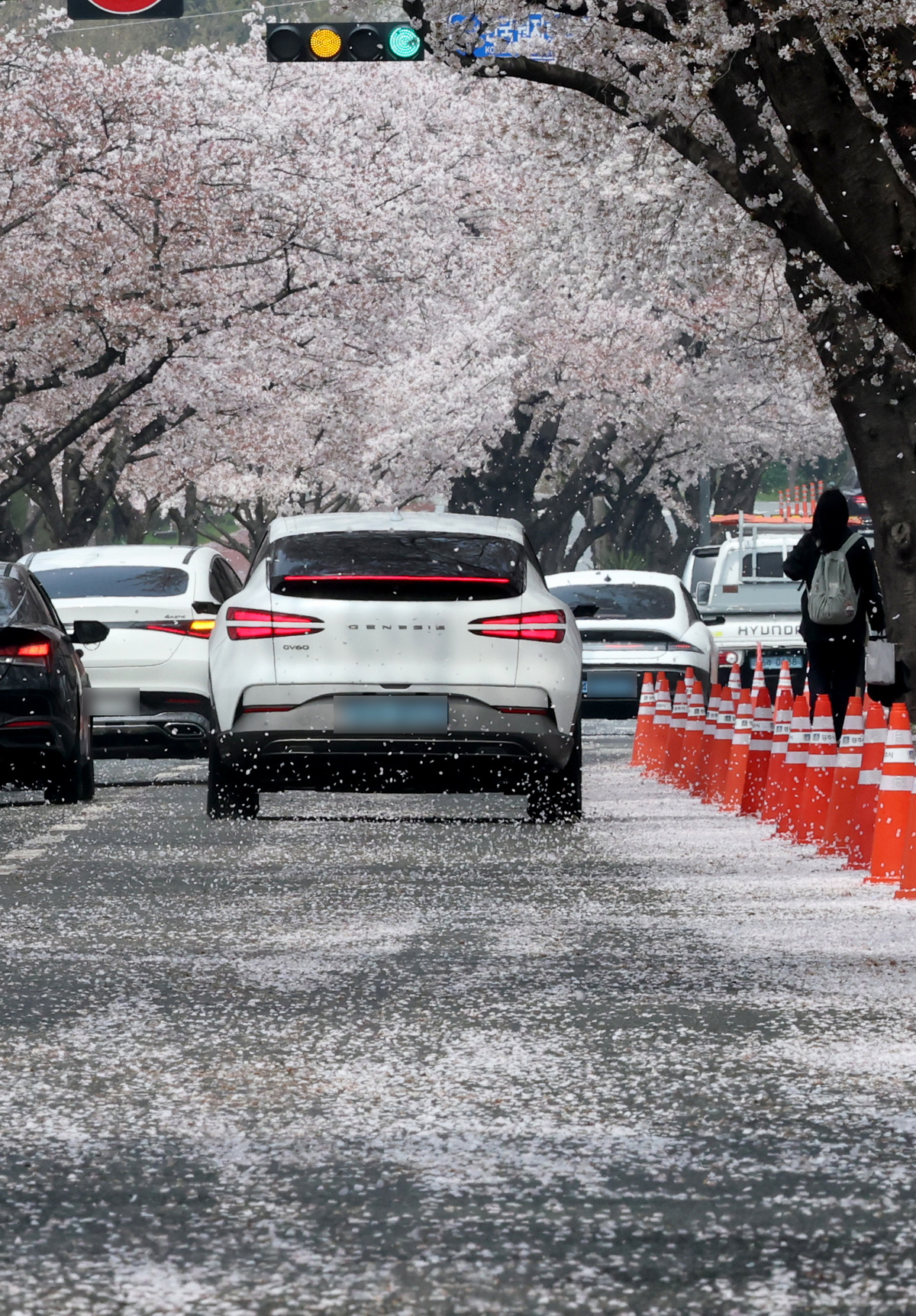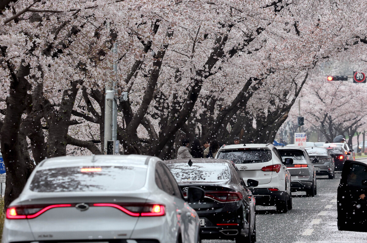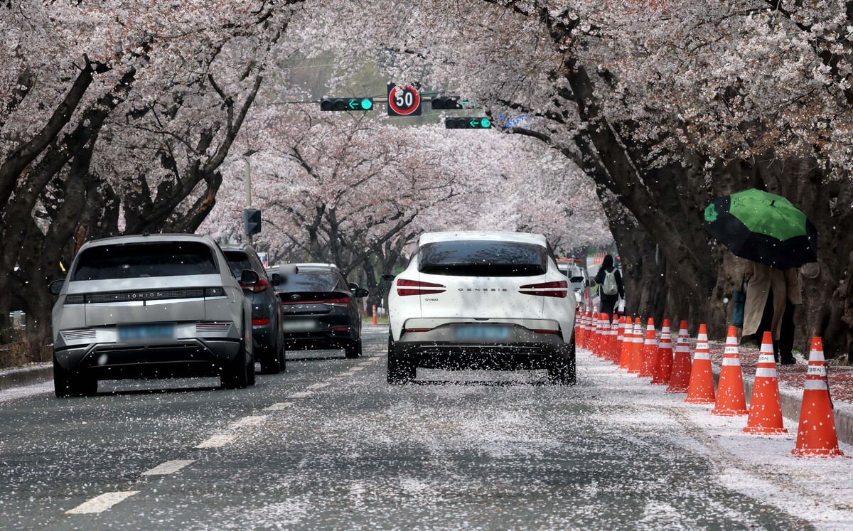봄비가 오락가락한 6일 오전 경주 지역의 대표적인 벚꽃 명소인 흥무로에 벚꽃잎이 날리며 벚꽃엔딩을 예고하고 있다. /이용선기자 photokid@kbmaeil.com
